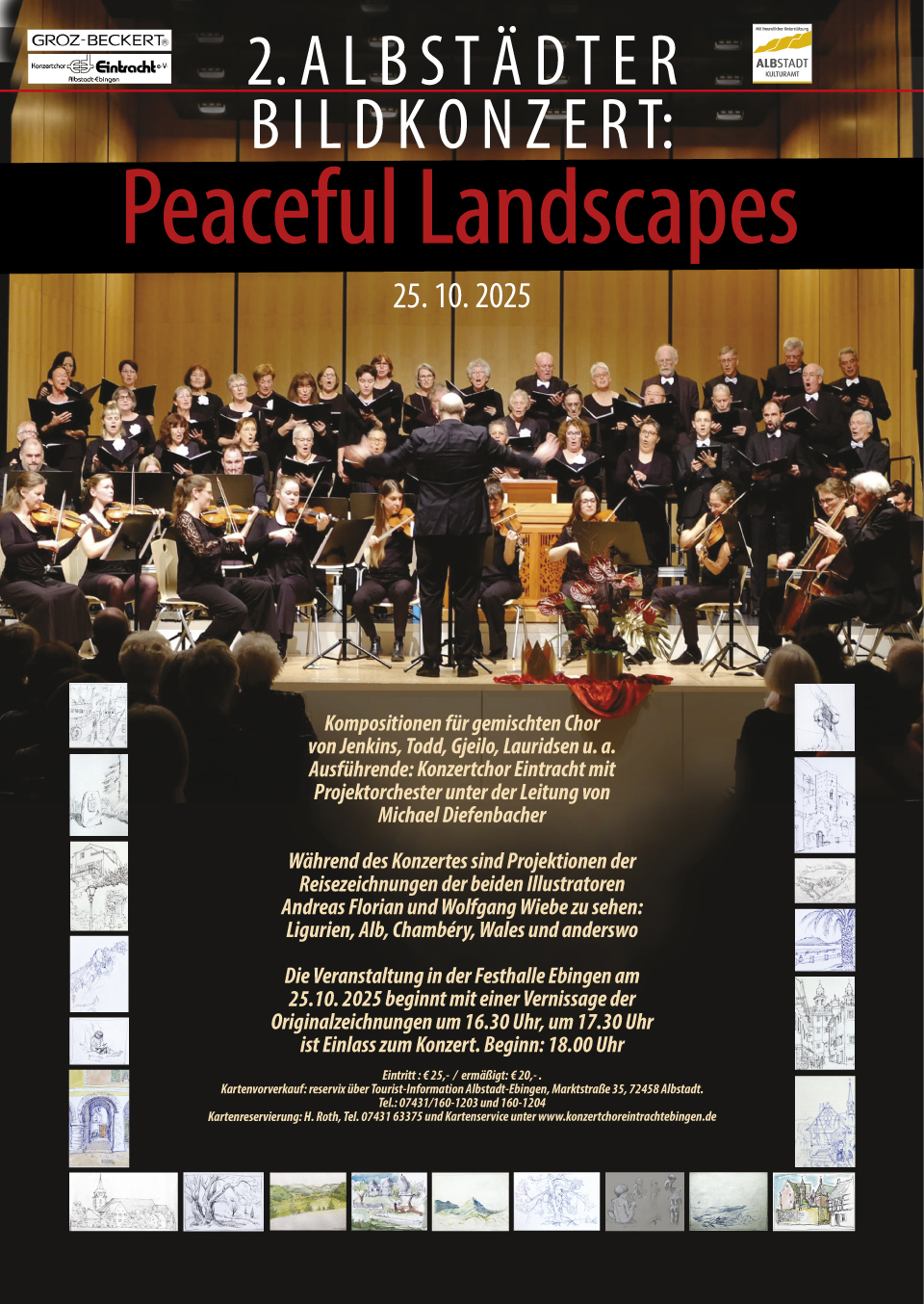 Im diesjährigen 2. Bildkonzert verschmelzen Chor- und Orchesterwerke der neuen zeitgenössischen Musik mit den Projektionen von Reisezeichnungen der beiden Albstädter Künstler Andreas Florian und Wolfgang Wiebe zu magischen Landschaften, zu Peaceful Landscapes für Auge und Ohr.